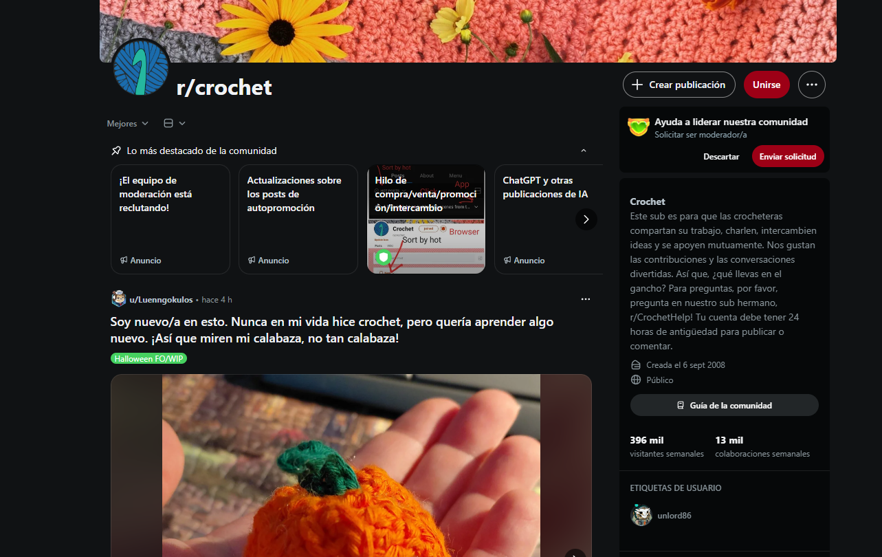 Introducció a la plataforma: Es va recomanar Reddit com a plataforma accessible i temàtica. Especialment, el subreddit r/crochet. Una comunitat global dedicada al teixit amb ganxet amb milers de membres actius. L’educador va acompanyar a la Sra. Ferrer en el registre d’un compte i en la subscripció a la comunitat, fomentant una aproximació crítica. És a dir, discutir sobre els potencials beneficis (intercanvi d’idees, suport mutu, etc.) i els potencials riscos (exposició a opinions negatives o dependència excessiva de l’entorn digital).